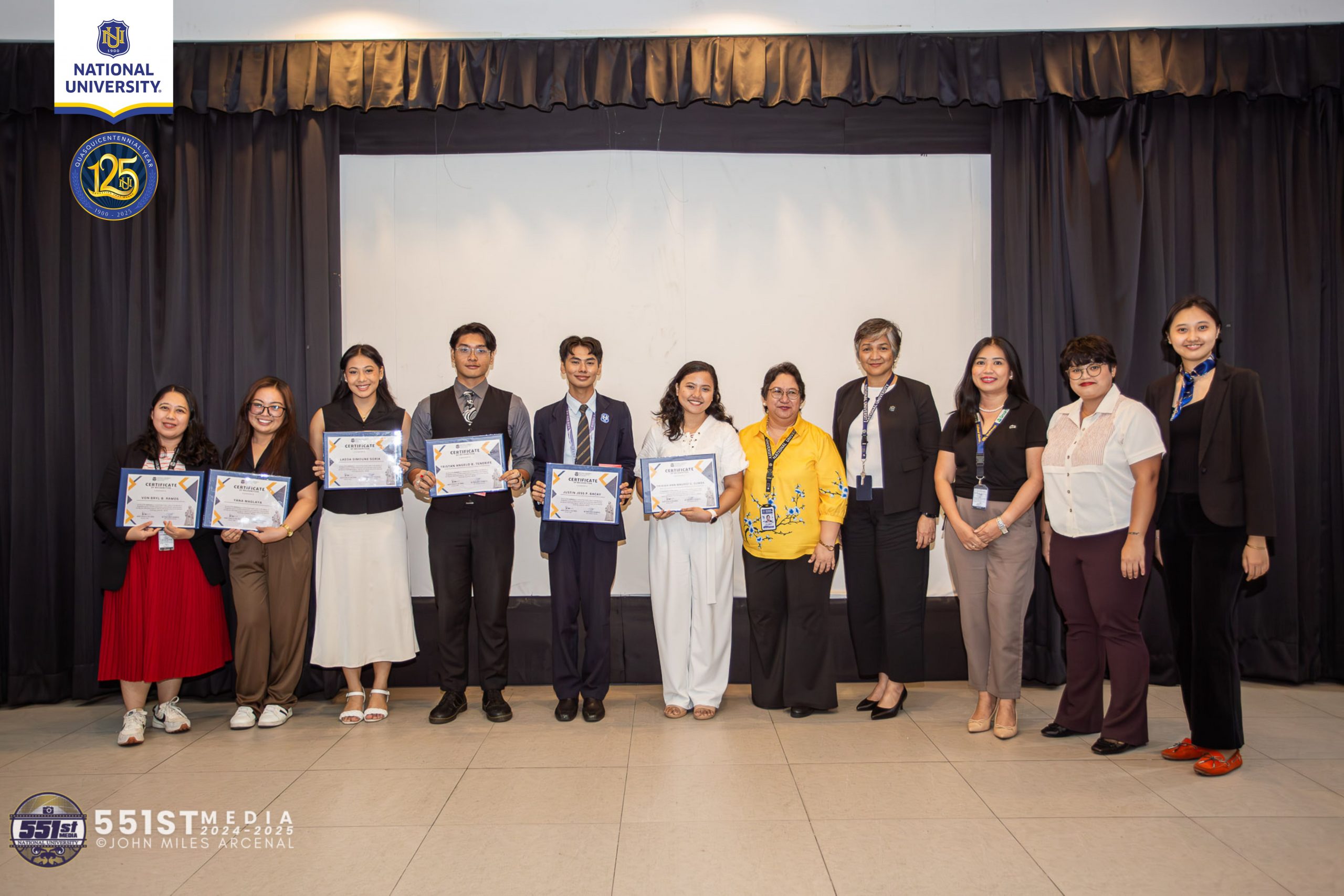 (In photo: L-R) Von Bryl Ramos (nominee) from CBA represented by Ms. Angelica Joy Laurente, Yana Maglaya (nominee) from COE, Laeia Simoune Soria (nominee) from CAH, Tristan Angelo Tenerife (nominee) from CCIT, Justin Jess Bacay (nominee) from CTHM, Trixiah Ann Gumba (nominee) from CEAS, Ms. Maria Louella Sta. Maria Academic, Internship and Placement Office Director, Dr. Arlene Trillanes NU VP for Operations, Ms. Ma. Reina Rose Gulmatico NU AVP for Academic Services, Ms. Erika Mae Valencia Academic, Internship and Placement Office Senior Supervisor and Ms. Lalaine CJ Evangelista Academic, Internship and Placement Office Assistant