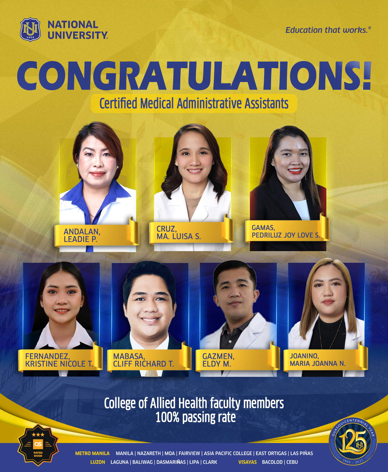NU Manila proudly congratulates the 7 outstanding faculty members from the College of Allied Health for achieving a 100% first-time passing rate in the Medical Administrative Assistant Certification exam via Certiport. Certiport is a leading provider of performance-based certification exams that validate essential digital, technical, and professional skills for students and workforce candidates worldwide.