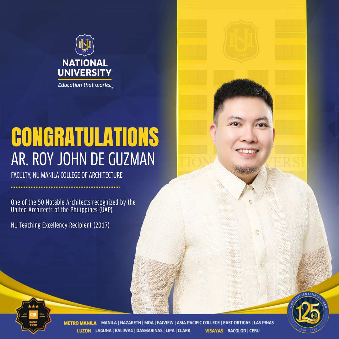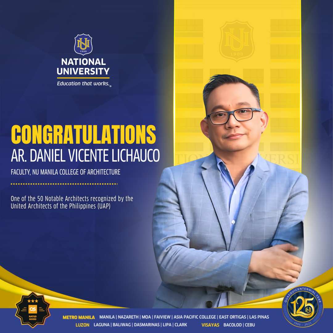 NU Manila proudly celebrates Ar. Daniel Vicente Lichauco and Ar. Roy John De Guzman for being named among the 50 ππ°π΄π΅ ππ°π΅π’π£ππ¦ ππ³π€π©πͺπ΅π¦π€π΅π΄ by the United Architects of the Philippines (UAP), in honor of the organizationβs 50th founding anniversary.