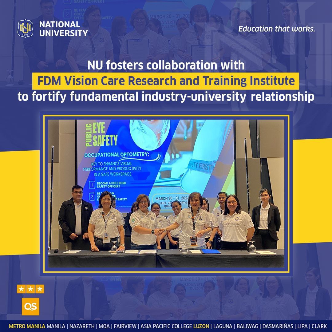 NU MOA signs a Memorandum of Understanding with FDM Vision Care Research and Training Institute to establish industry-university relationship to integrate opportunities for research, sponsorship, endorsements, internship and externship collaborations for both parties.