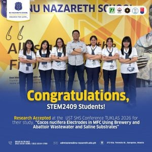 NU Nazareth School continues to uphold its commitment to academic excellence as its Senior High School STEM 2409 students earn acceptance to present their research at the UST SHS Conference, TUKLAS 2026: Lighting the Future Through Research and Multidisciplinary Collaboration, happening on April 27–29, 2026.