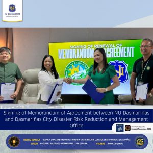 NU Dasmariñas has sealed a crucial partnership with the Dasmariñas City Disaster Risk Reduction and Management Office (CDRRMO) by signing a Memorandum of Agreement (MOA) earlier today. The event took place at the Office of the City Mayor within the Socio Economic Building, City of Dasmariñas. Spearheaded by the NU Dasmariñas National Service Training Program (NSTP) and Community Extension Office (ComEx), this partnership is designed to strengthen disaster resilience and collaboration throughout the city, particularly in times of crisis. The […]