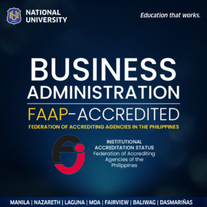 The National University community takes pride in the Federation of Accrediting Agencies in the Philippines accreditation of the Business Administration program.