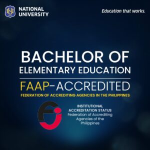 The National University community takes pride in the Federation of Accrediting Agencies of the Philippines (FAAP) accreditation of the Bachelor of Elementary Education program of NU Manila. The FAAP is an umbrella organization of the three accrediting agencies (ACSU-AAI, PACUCOA, and PAASCU) authorized by the Commission on Higher Education and Department of Education. #EducationThatWorks