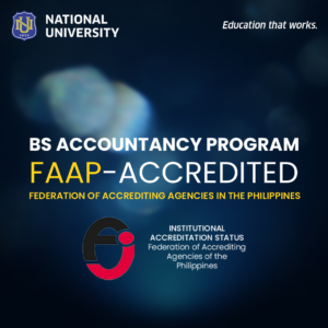 At National University, we are committed to our promise of academic excellence and quality education. Our FAAP accredited programs offered in our Manila campus enable us to continue our mission of building the nation through #EducationThatWorks. The FAAP is an umbrella organization of the three accrediting agencies (ACSU-AAI, PACUCOA, and PAASCU) authorized by the Commission on Higher Education and Department of Education.