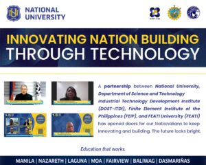 Through the efforts of Finite Element Institute of the Philippines (FEIP), National University is now part of a quadripartite collaborative agreement that aspires to uplift, support, and promote innovation in the Philippines. Joining hands with the Industrial Technology Development Institute of Department of Science and Technology (ITDI-DOST) and FEATI University, National University has access to technology that will allow simulations and laboratories to build and test our creative ideas. National University community builds the nation, with Education That Works.