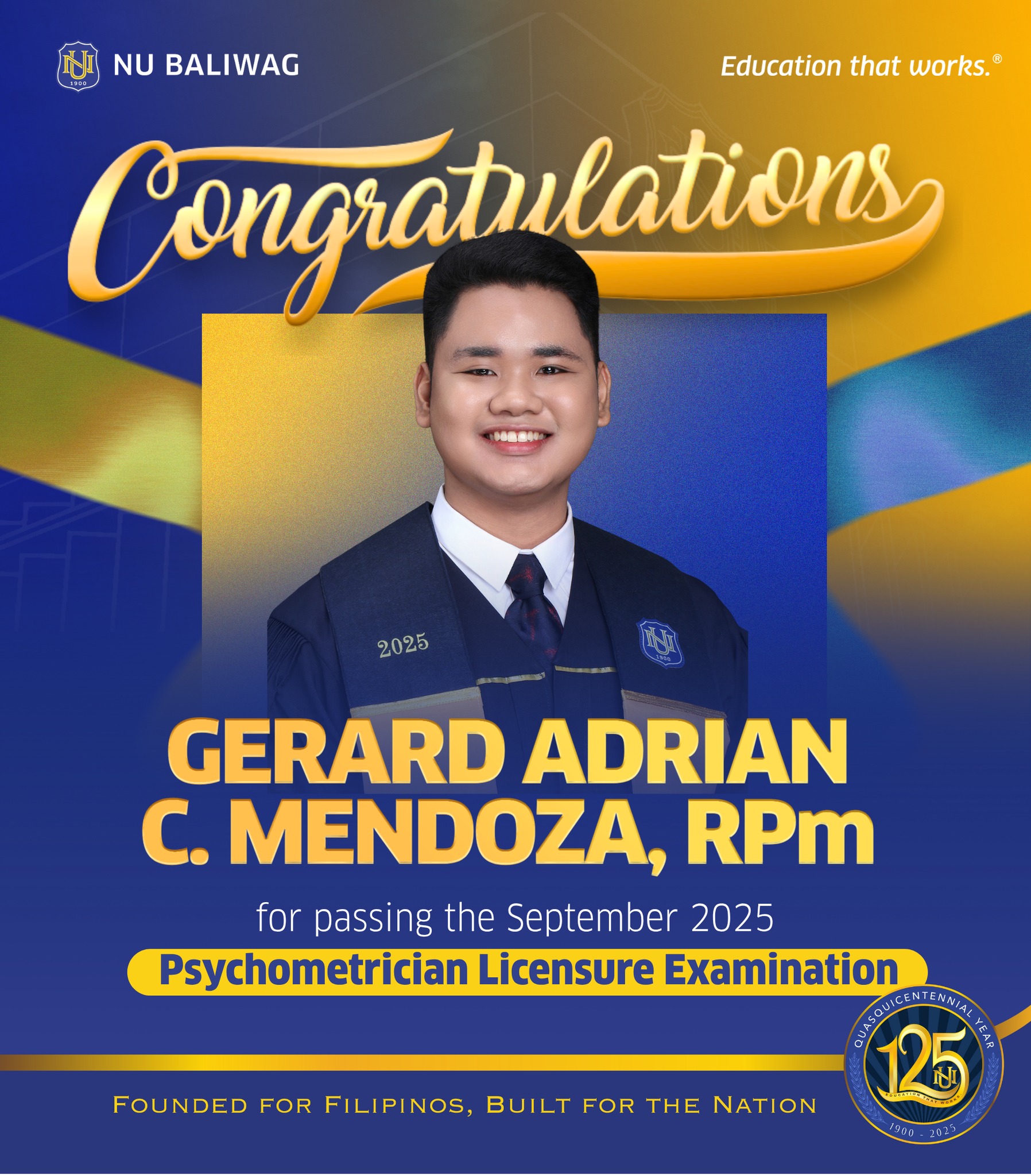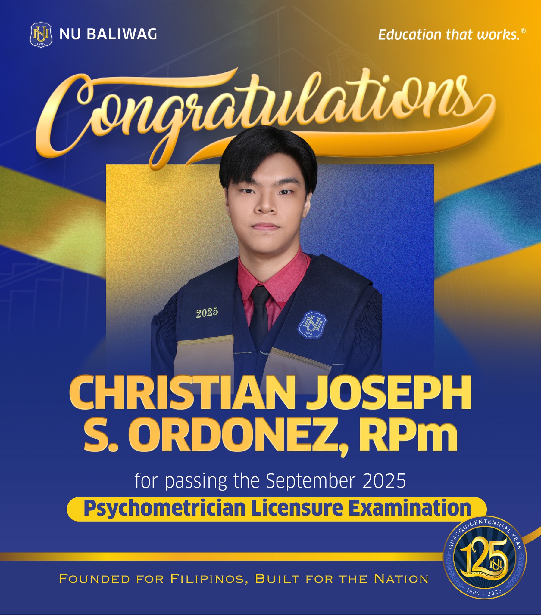NU Baliwag once again proves its commitment to academic excellence! The School of Education, Arts, and Sciences proudly celebrates a remarkable 92% passing rate in the September 2025 Psychometrician Licensure Examination—well above the national passing rate of 86.98%.