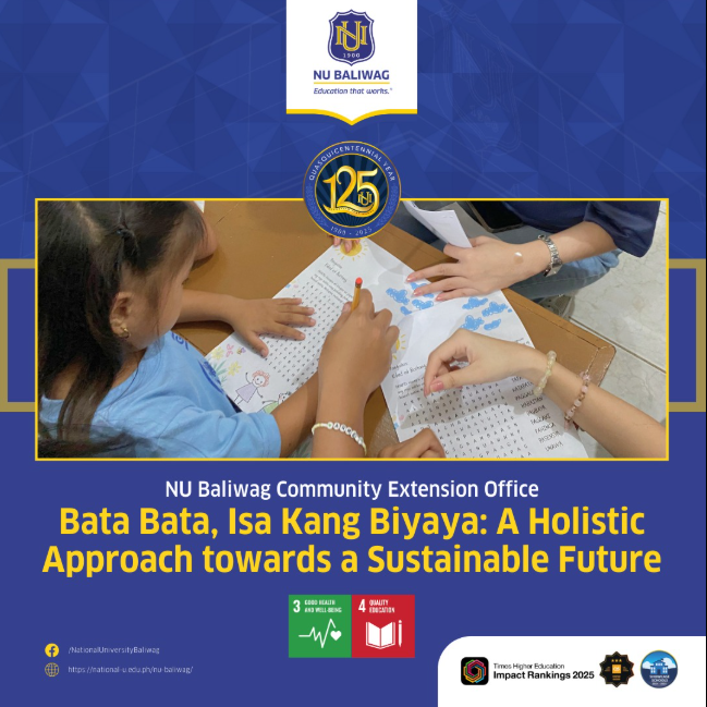 NU Baliwag continues to uphold its commitment to community engagement and sustainable development through the impactful initiative, “Bata Bata, Isa Kang Biyaya: A Holistic Approach Towards a Sustainable Future.” This meaningful project reflects the institution’s dedication to fostering positive change by addressing the needs of children in a well-rounded and sustainable manner.